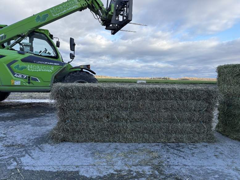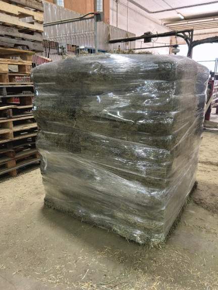 Ce qui nous différencie des autres entreprises qui vendent du foin c’est que nous avons un compacteur pour faire de petites balles plus facilement manipulables que les grosses balles sans affecté la qualité et la solidité des galettes. Ce compacteur nous permet de couper les grosses balles pour faire des petites balles qui sont placées sur des palettes ce qui rend la manutention beaucoup plus simple. De plus, les petites balles compactées sont plus petites et plus denses que les petites balles standards ce qui optimise le transport et l’entreposage.