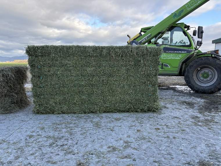 Selon les lots de foin, nous avons 2 grosseurs de grosses balles carrées. Il y a des 3’ X 3’ X 4’ qui pèsent autour de 800 livres et il y a des 3’ X 4’ X 8’ qui pèsent autour de 1200 livres. Le poids exact des grosses balles varie en fonction de lots, mais ce sont des poids moyens. Ces balles doivent être bougées à l’aide d’un tracteur.